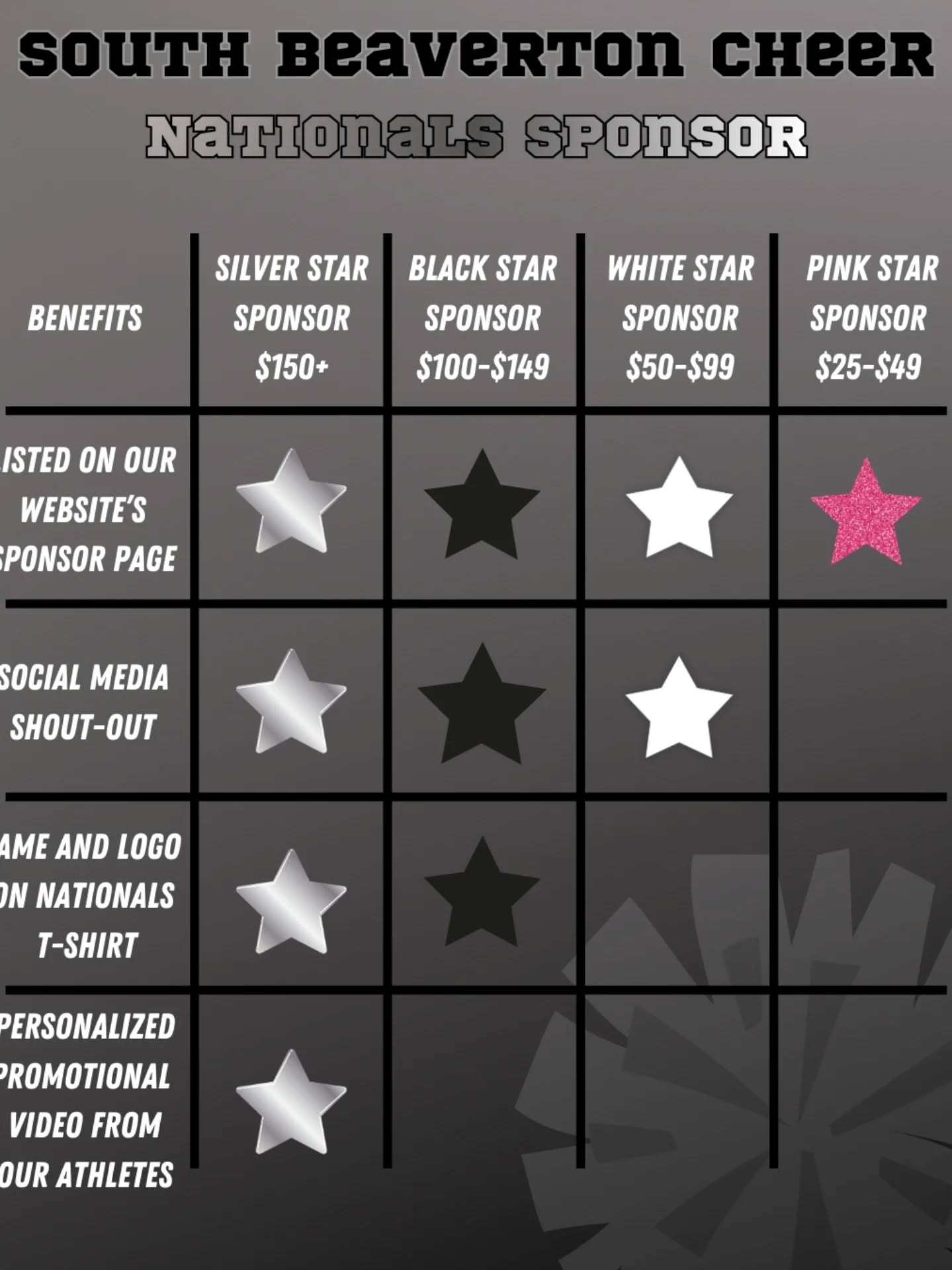 - Your business logo or personal name with contact information and website link on our website sponsor page – www.sbycheer.com